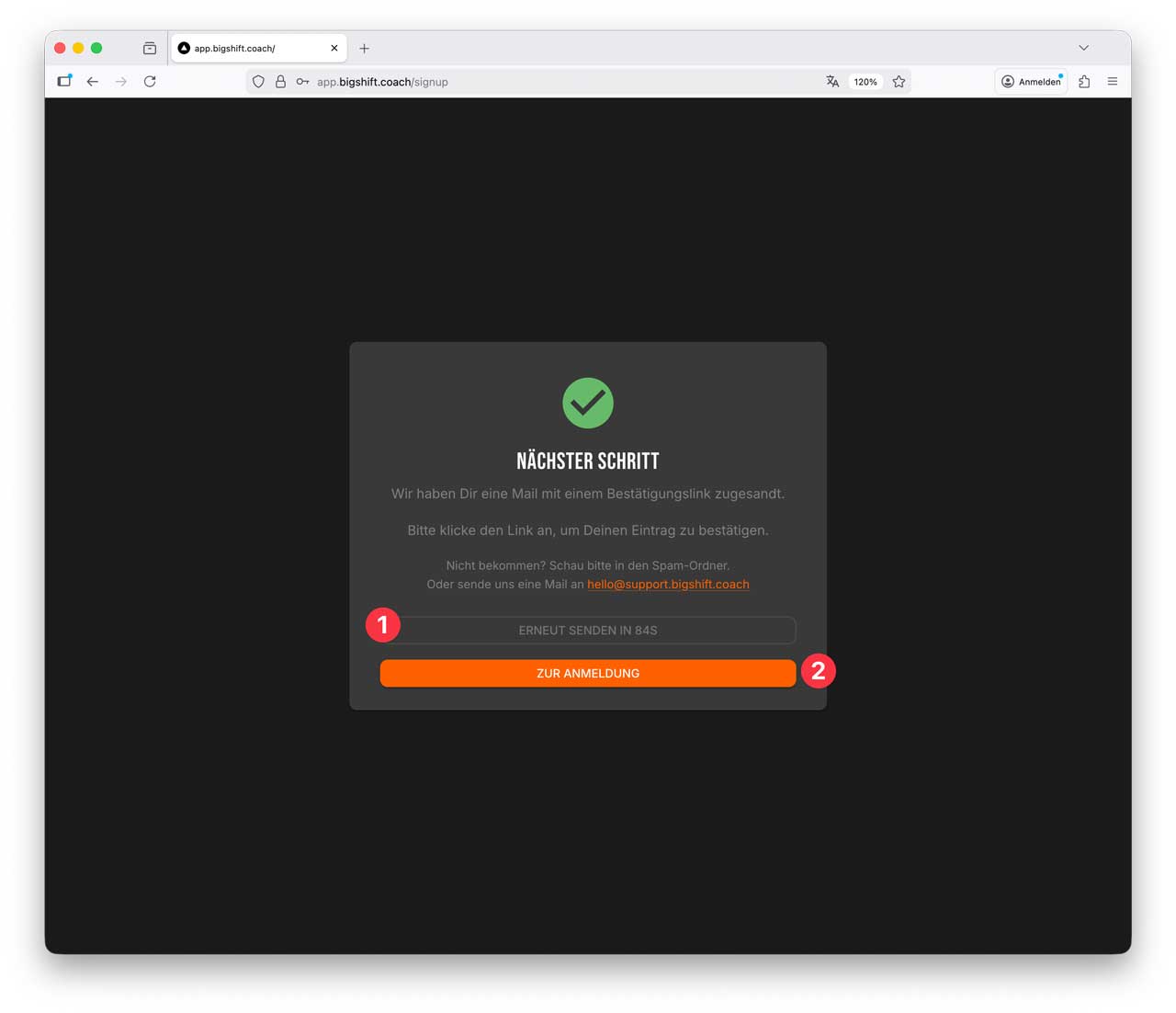 (1) Solltest Du nach maximal 2 -3 Minuten keine Mail erhalten haben, kannst Du eine weitere Mail anfordern.